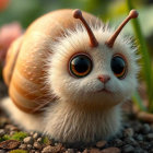 A whimsical, snail with fluffy fur, large expressive eyes, and tiny antennae. It sits on a bed of pebbles amidst soft greenery and flowers, radiating a charming, endearing vibe.