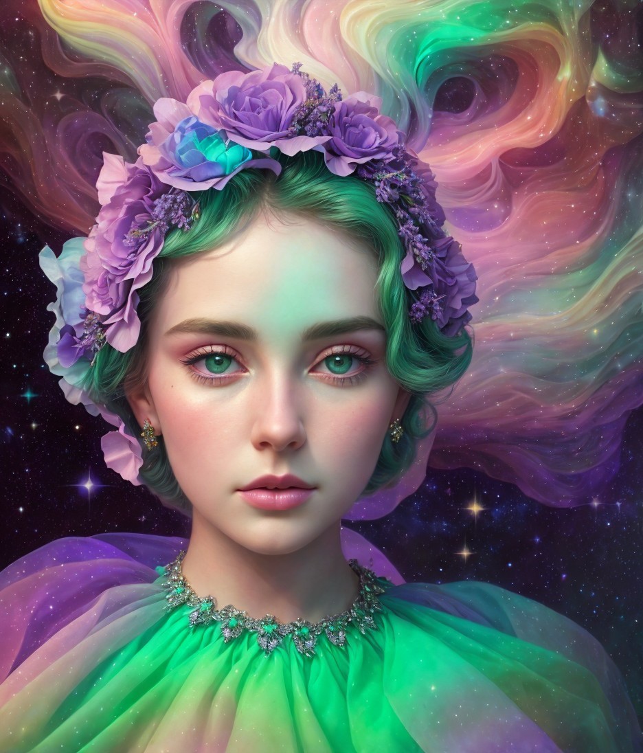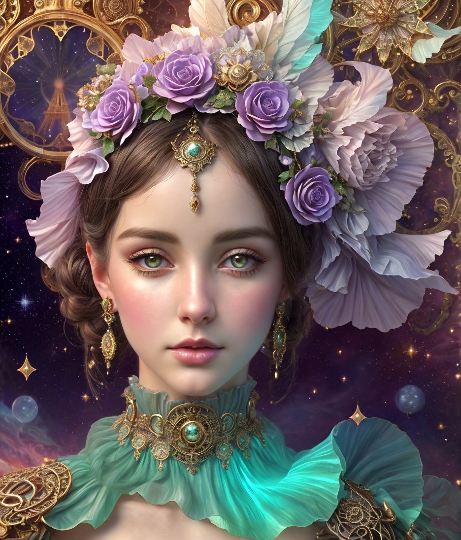 Watercolor and ink, portrait of beautiful female face, upper body portraiture, Steampunk, ornamental jewelry, frilly translucent garments, astronomical scenery, style of Dee Nickerson, Watercolor and ink, beautiful female enchantress in rain, chiaroscuro lighting in chaotic background, edwardian, anglocore 1.7, detailed cheeks, realistic nose, wavery ink, textured paint, grunge, High coloring, detailed close-up portrait, stylized face , watery ink, Delicate, Dainty, Petite, Slender, Rosy-cheeked, Bright-eyed, Smiling, cute, sweet, fine streaks, dethereal, bioluminescent eyes, Soft wavery hair, flares, splashes, soft edges, back-lit, triadic color scheme purple beige blue, hues, gothical, instaport style 1.6, 3d lighting effects, fauvism 1.7, chiaroscuro lighting, ambient occlusion 1.5, shadow mapping 1.3, intricate stylized hairstyle, brightness 1.7, coherent, fauvistic, eerie, occult, retropunk, creamy, vaporwave, plasticity 1.6, sweaty, grain, occult, auracore, high coloring 1.9, mosscore 1.7, cottagegore 1.9, retrofuturistic details of ornate, maximalism, radiance, raytraced shadows 1.8, brightness 1.4, silver particles, dreamy glow, tints of abstract art nouveau illustration, gothical fantasy art, highly detailed ornamental features, octane render illustration 1.5, complexion 1.4,