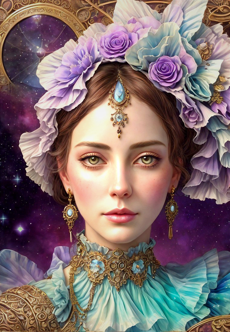 Ethereal portrait, astronomical scenery, style of Ryan Smallman, dreamy and ethereal, expressive pose, realistic detailed eyes, tremendous expression, ornate frilly dress,