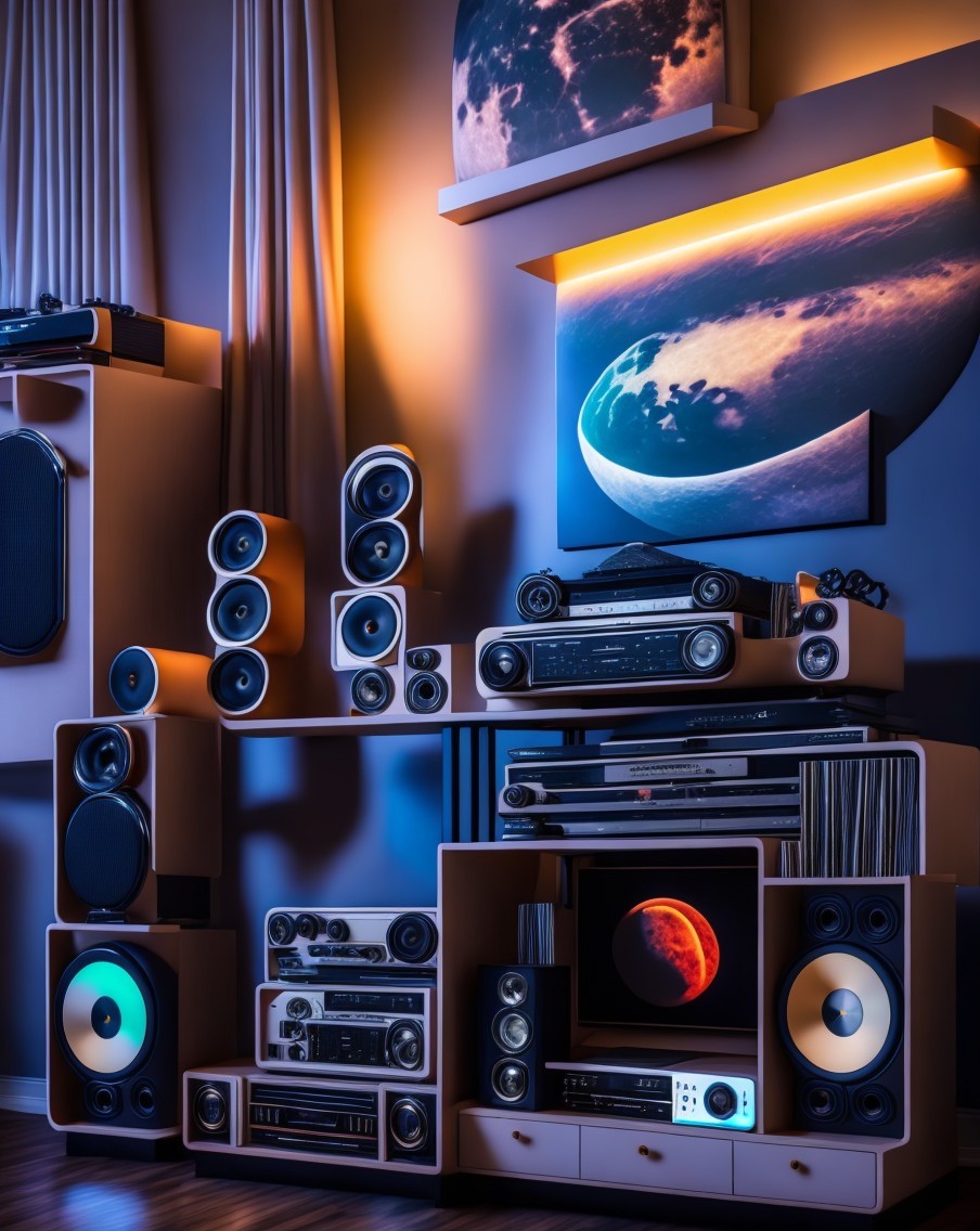 Prompt: Picture a sleek, modern room with a vintage twist. The centerpiece of the room is a high-fidelity (HiFi) stereo system, with a record player spinning vinyl, and speakers that look like they could blast sound waves to the moon. The entire setup exudes a retro vibe, but with a modern, clean aesthetic. The colors are a mix of warm, rich tones and cool, metallic accents. The atmosphere is undeniably sexy, with a hint of nostalgia for a time when music was king.