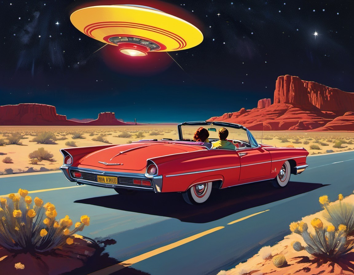 Prompt: A young couple sit in their vintage red convertible facing the front. She is playing with the radio tuner as they drive down a dark road in the nighttime desert toward Las Vegas. Behind them, there is a big bright yellow flying saucer type spacecraft in a starry sky.