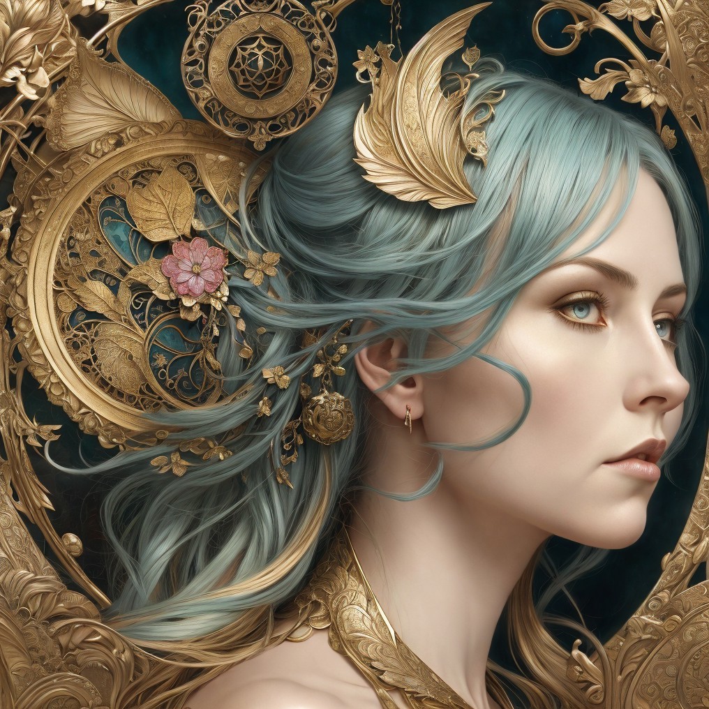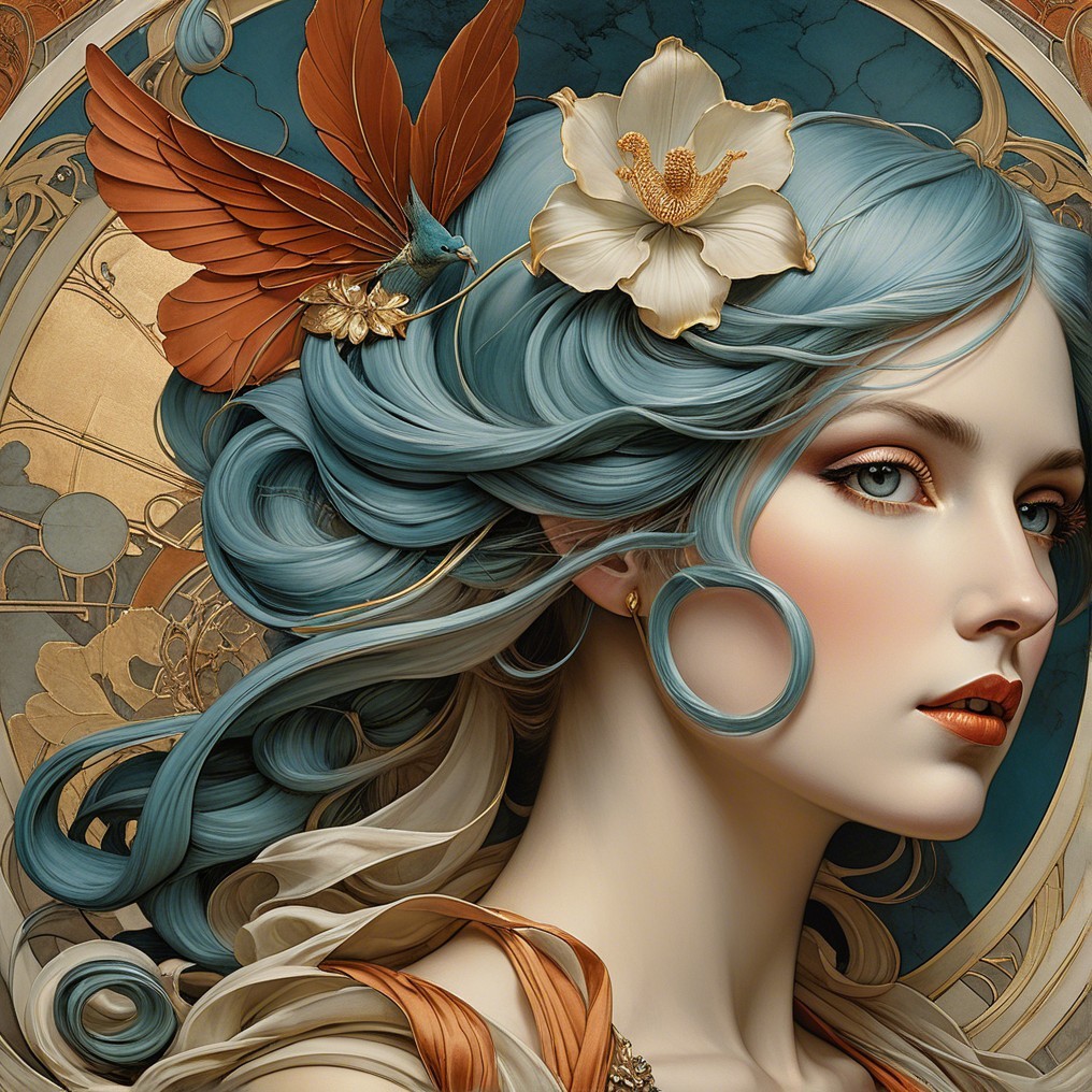 A serene profile of a woman with flowing, pastel blue hair adorned with a golden fan and a hibiscus flower. Her elegant earrings and soft makeup enhance the enchanting, artful aesthetic.