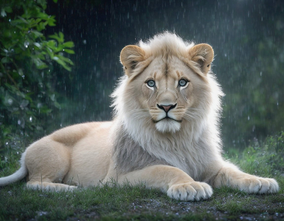 (Try it from Catwoman) - A majestic lion rests in a lush, rain-kissed landscape, its thick mane glistening. The creature gazes intently, embodying strength and tranquility amidst nature's beauty.