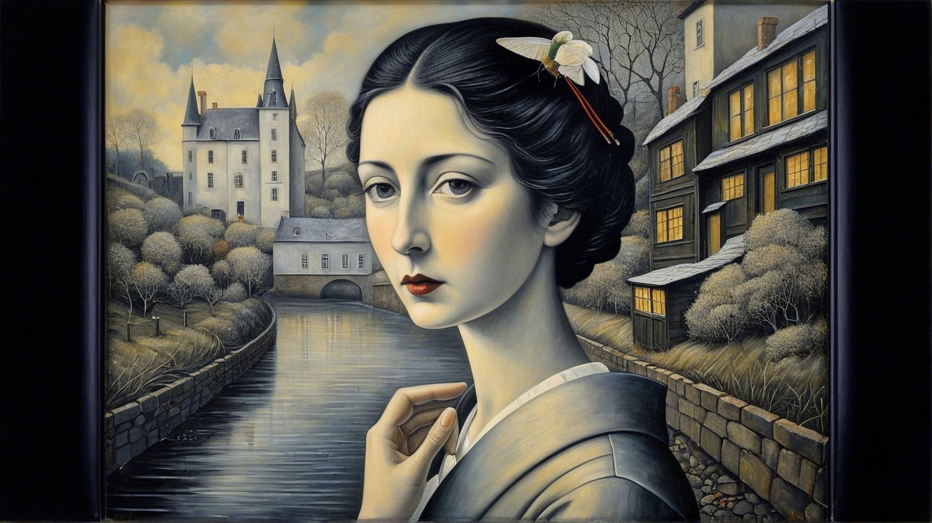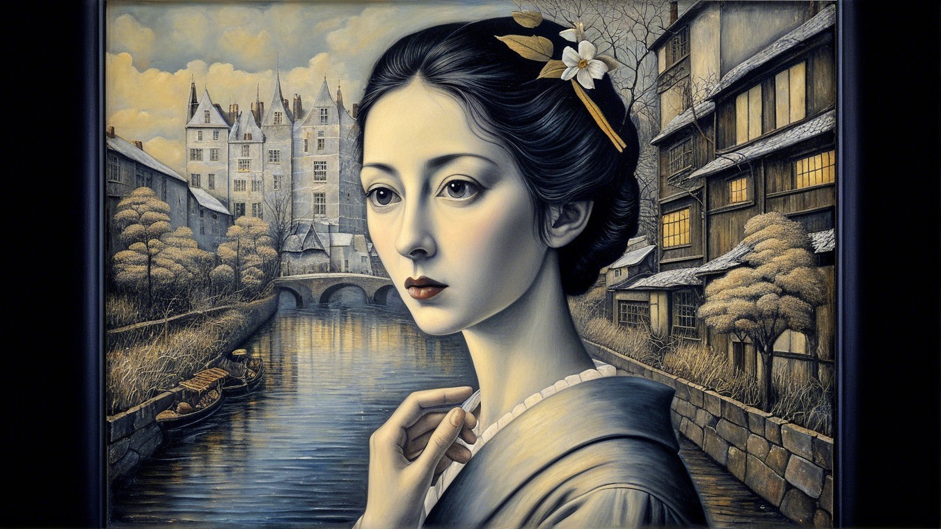 A serene portrait of a young woman with dark hair adorned with a flower, set against a tranquil landscape featuring a castle and quaint houses by a reflective river.