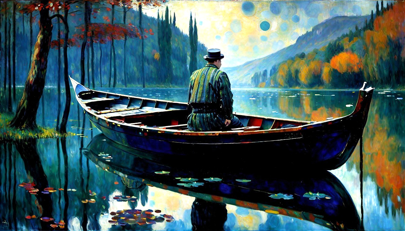 A man sits in a canoe on a tranquil lake surrounded by autumn foliage, reflected in the water's still surface.