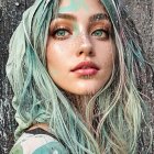A young woman with vibrant, pastel teal hair and striking green eyes poses against a textured, graffiti-covered wall. Her makeup features bold accents, enhancing her unique and artistic vibe.