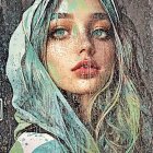 + Prompt:Headshot of beautiful young woman inspired by grungy street-art aesthetics. Lingering, dyed close-up, posh, sappy, slightly wavy hair adorned with light streaks in sea-green, visible tetures, liminal, hues by Ho Baron and Lawrence Schwinger, polished uncommon, unique, dof, debeh, bokeh, contoured outlines, warm coloring, dyed, dof, debeh, bokeh, tall and lean details, rushing, moving, agile, imaginative, warm colors, harmonious watercolor and ink fusion, comous, posh, elegant, flowing dynamic lines, varying line weight and width, displacement mapping 1.2, mip-mapping 1.2, parallel lining, precise mark-making. surreal lineage forms, Magical realism by John Buscema, luminism reminiscence, beautiful line-art,subsurface scattering 1.3, parallax occlusion 1.3, raytraced shadows 1.3, harmonious details, agile, mystical, 3d effects, warm tones, synthetic, hand-drawn illustration, opulent, graceful, strategic negative space utilization, radiance, bold and expressive ink strokes, delicate watercolor blooms, blend of George Condo's & Georges Braque's cubism and Ho Baron's surrealism intertwined with psychosomatic surrealism and Juminocore by Stan Lee, abstract post-avantgarde, dreamy, wavery, thinned watercoloring in gradient inking colors, dystopian, stylized, intricate indiecore details, wavery dappled lighting, zentangle, rim lighting, otherworldly ambiance with inkpunk influences, tesselated, complex color hues, angled, plushy, tactile street-art influence, rewildered, detailed whimsical traumacore linework with intricate hatching, soft and ethereal lighting, a surreal atmosphere, infusion of Juminocore essence with comic book aesthetics inspired by Patrick Nagel and William Bradley, stippled shadows for depth, congrous textured details, cohesive and detailed line art reminiscent of Louis Jover's style. Tetradic color scheme light-green dark-beige light-black light-grey, anisotropic filtering 1.3, dynamic lighting, luminism, hues by Ho Baron, micro-pen outlines, color glitches, street art style by Juan Brufal.