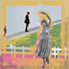 The image features a vibrant, surreal landscape with a dancer in a sparkling dress at the forefront, contrasting with shadowy figures in the background and a colorful, abstract setting.