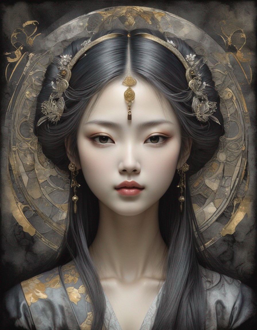 Legend of the Girl of the underworld. Medieval Japanese Artists Sumi-e Style, Velvet Black, Shabby, Dull Gold, Amber Gray, Golden Ratio, Surreal Fantasy, Elegant, High Definition Ultra Fine 3D Line, Zenangle Style, Watercolor Patchwork ,