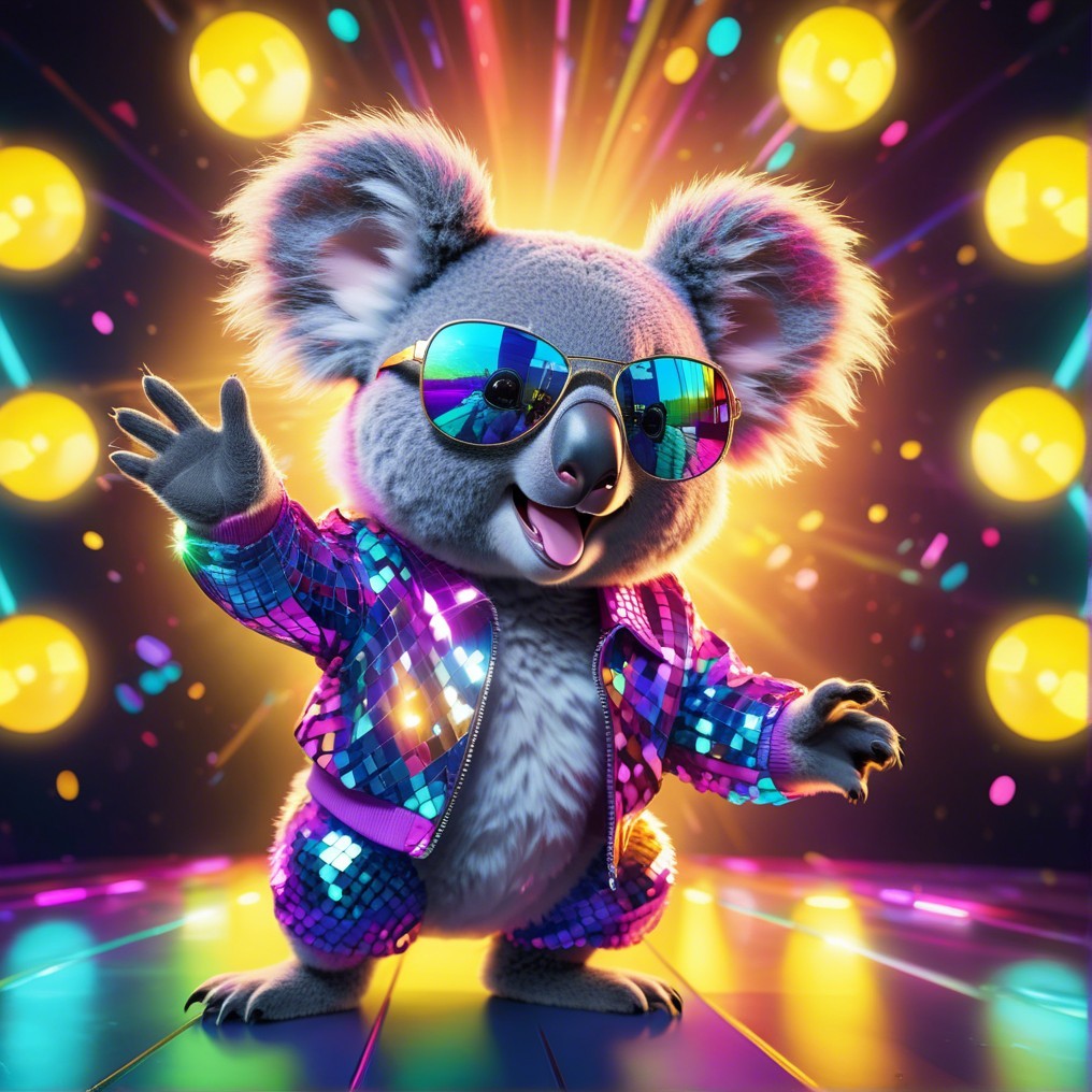 A playful, shiny koala wearing colorful sunglasses and a sparkling jacket dances joyfully against a vibrant, disco-themed background filled with glowing lights.