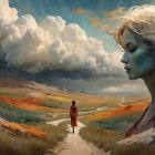 A serene woman with flowing blonde hair stands against a dramatic desert landscape, featuring valleys and ominous clouds above. A distant chariot moves through the warm, sandy terrain.