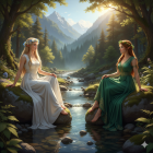 Two elegant women in flowing green outfits sit on a mossy log by a serene lake, surrounded by mountains and lush greenery, exuding a sense of tranquility and natural beauty.