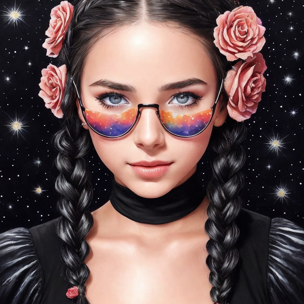 Magical starry night. Beautiful, cute, freckled girl model with beautiful eyes, braids and sun glasses in beautiful black-orange dress in xion's style - girl from game kingdom hearts. Stunningly beautiful face. Stunningly beautiful place. splashes of lovely color. painting made by colorful pen. roses and butterflies. Colorful Painting painted by genius painter.