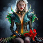 A striking figure in a shimmering green dress with bold ruffles and a dramatic neckline, adorned with a metallic collar and holding a vibrant red flower, set against a smoky background.