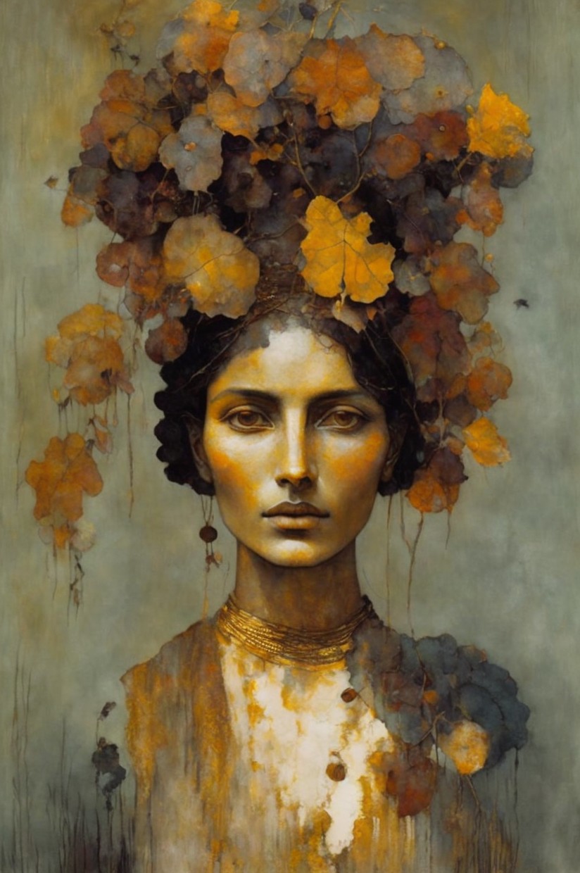 Prompt: "Beautiful woman, portrait in ochre, patina of ancient stone with moss, art brut, moody, somber, desaturated colors, in the style of Paul Klee, Arthur Rackham