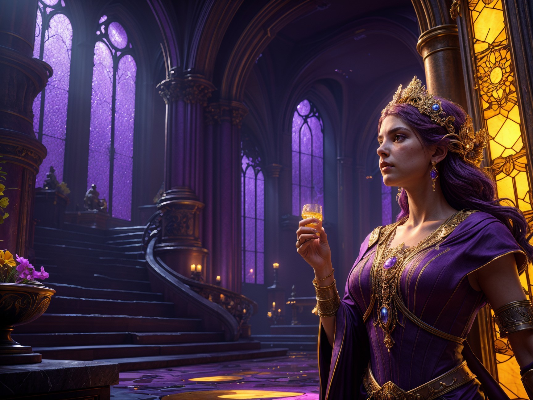 A regal woman stands in an ornate, dimly lit hall, holding a glowing chalice. Her majestic attire and crown contrast with the enchanting purple light from stained glass windows.
