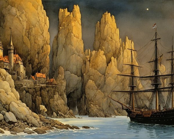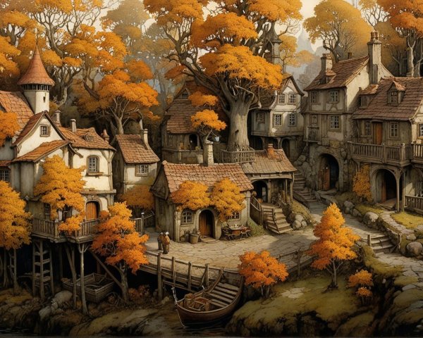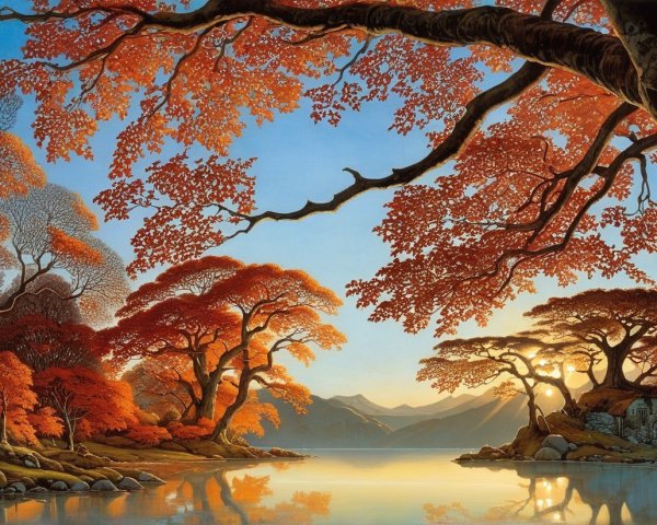 A serene woman stands by a tranquil water body, enveloped in soft drapes of blue and gold. Her gentle expression blends with the lush, mystical forest surrounding her.