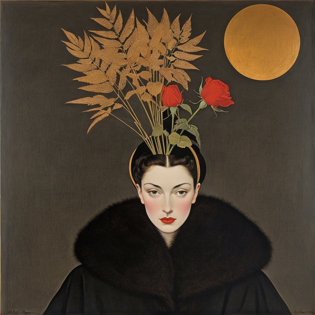 The artwork of Walter Martin Baumhofer and rené gruau is characterized by its whimsical, beautiful, poignant, and touching nature. The color palette often includes shades of rose, gold, rust, burgundy, and black. Artists like Annigoni, Egon Schiele, Milo Manara, Botticelli, Catrin Welz-Stein, Jean Metzinger, and Klimt create soft watercolor pieces with extra water, showcasing an Art Deco style. The attention to detail is evident in the perfect eyes, perfect hands, and highly detailed faces. Complementary colors are used to enhance the overall effect. Watercolor and ink splatters add a dynamic element to the artwork, often set against a dark blue background. Artists like greg rutkowski, loish, rhads, beeple, makoto shinkai, lois van baarle, ilya kuvshinov, rossdraws, tom bagshaw, and alphonse mucha employ techniques like global illumination to create detailed and intricate environments. Other notable artists in this style include Arthur Rackham, Grant Wood, Paul Klee, Lisa Frank, Van Gogh Illustration By Marguerite Delorme, Chokha, Marguerite Zorach, Edward Gorey, and junji ito. The use of gold and silver leaf colors adds a luxurious touch to the artwork