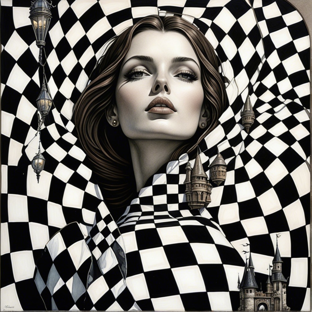 The artwork features a woman with striking features surrounded by a swirling black-and-white checkerboard pattern, incorporating elements of nature and a ship, creating a surreal atmosphere.