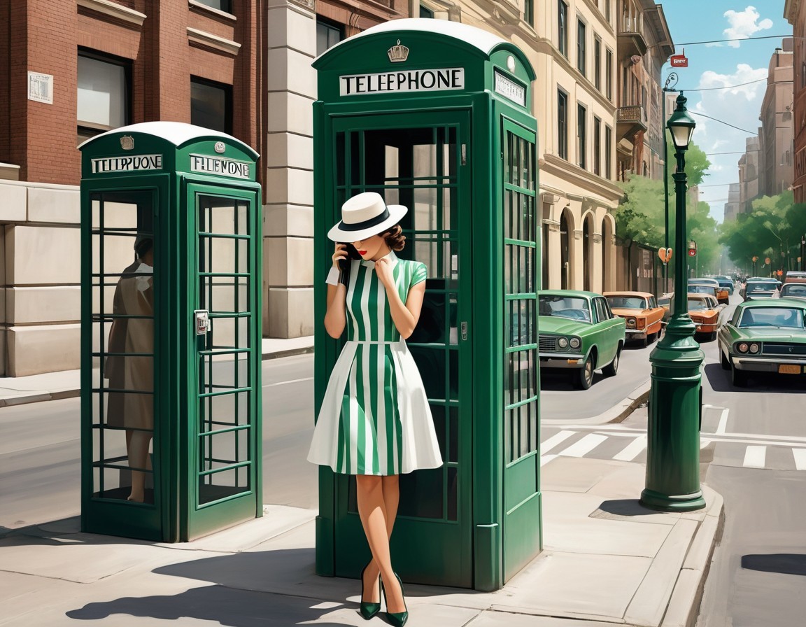 A stylish woman in a green and white striped dress leans against a vintage telephone booth, exuding retro charm against a backdrop of classic cars and lush city greenery.