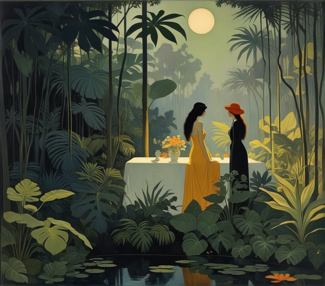 A silhouette of a woman in a flowing orange dress stands amidst lush green foliage, gazing at a glowing moon above in a serene jungle setting, reflecting on a calm water surface.