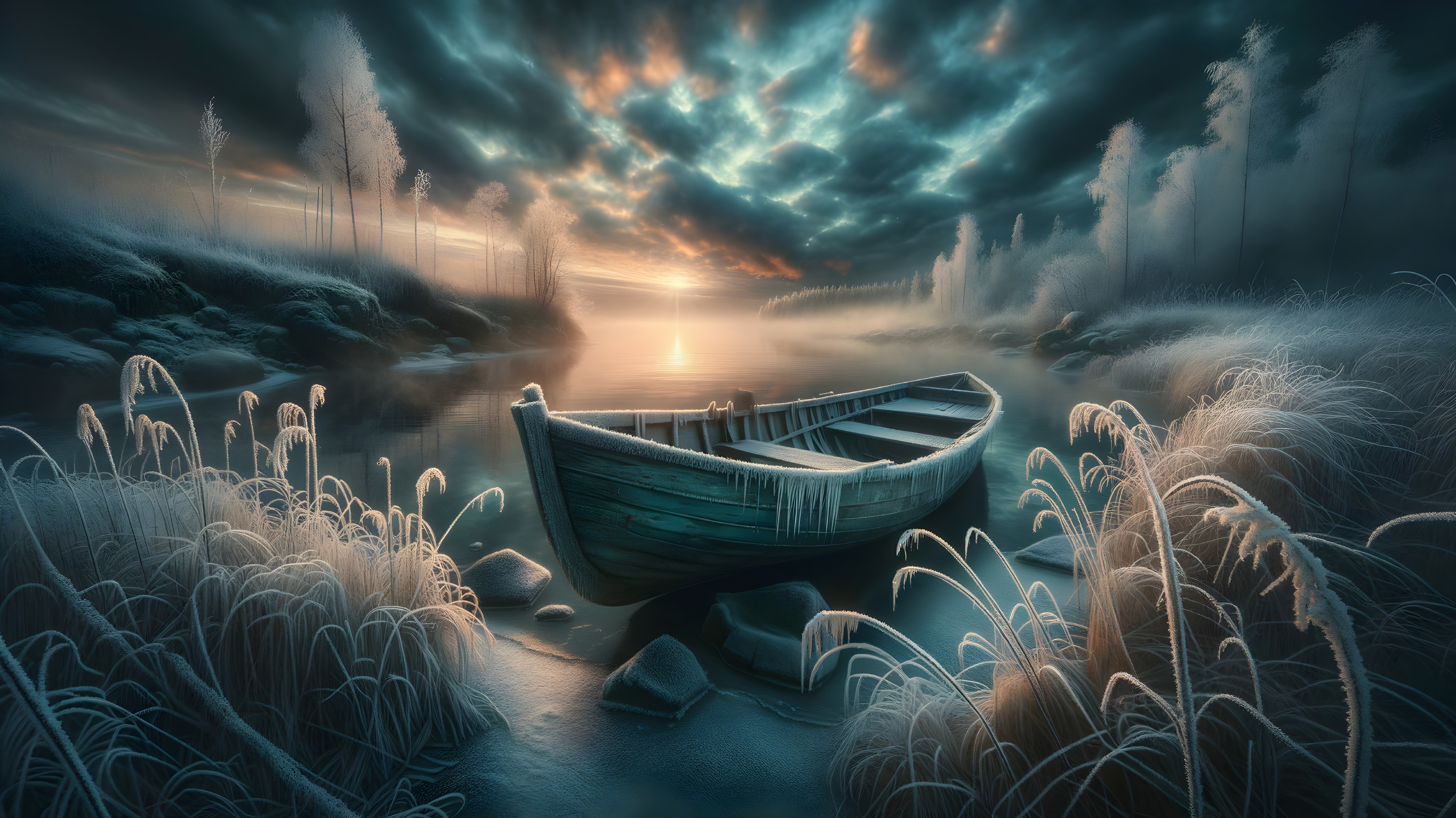 A serene landscape at dawn features a frosted, abandoned boat on a still river. Ethereal clouds reflect soft colors in the water, while frost-covered grasses frame the tranquil scene.