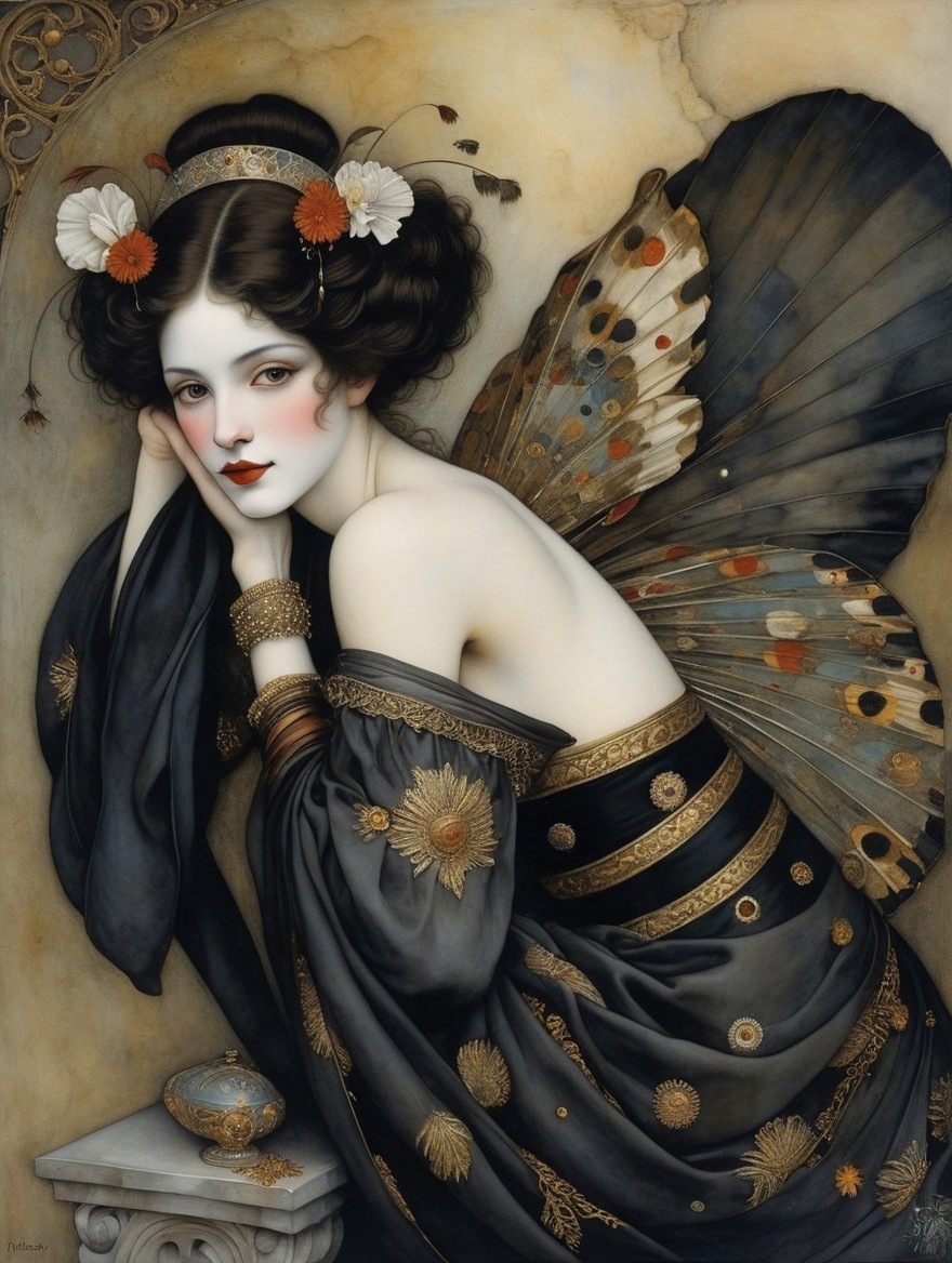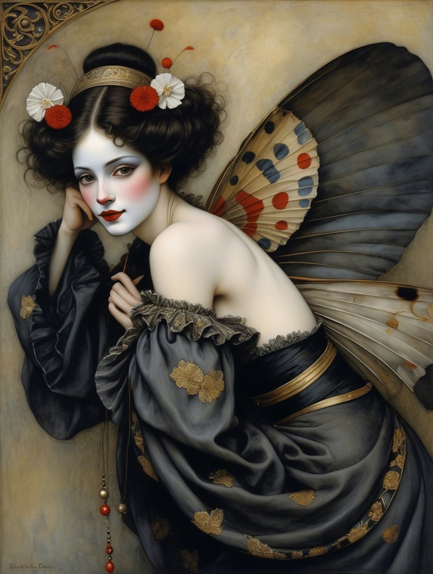 A striking portrait of a woman with voluminous curls wearing a black dress and a top hat adorned with flowers, gazing thoughtfully, while a clown with bright orange hair peeks from an alcove behind her.