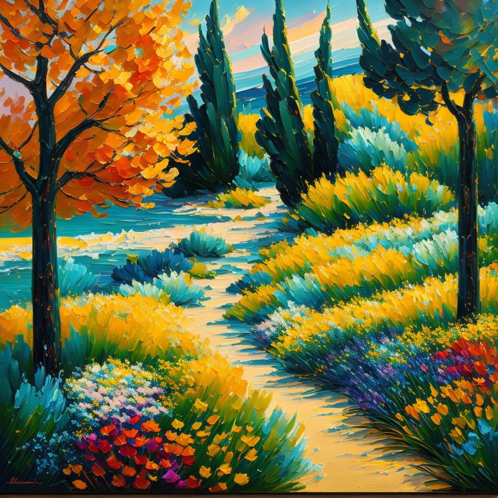 A sunlit wild coastal path unfurls among bursts of golden and blue wildflowers, bordered by cypress trees and framed by the endless, free ocean. Thick brushstrokes and radiant colors capture the raw, untouched energy of nature in a dreamlike, eternal moment.
