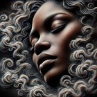 A close-up of a woman with flowing, wavy hair and a radiant complexion adorned with shimmering beads and highlights, set against a stunning backdrop of swirling gold and bronze tones.