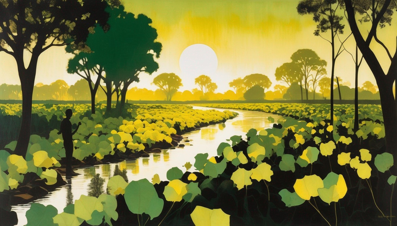 + Prompt:enhance by adding cotton bolls growing in foreground and making everything more yellow and less lush: shimmering summer heat, trees and cotton plants growing by the slow brown river, by Aaron Douglas, in humid yellow and green, with the silhouettes of people torn from black tissue paper