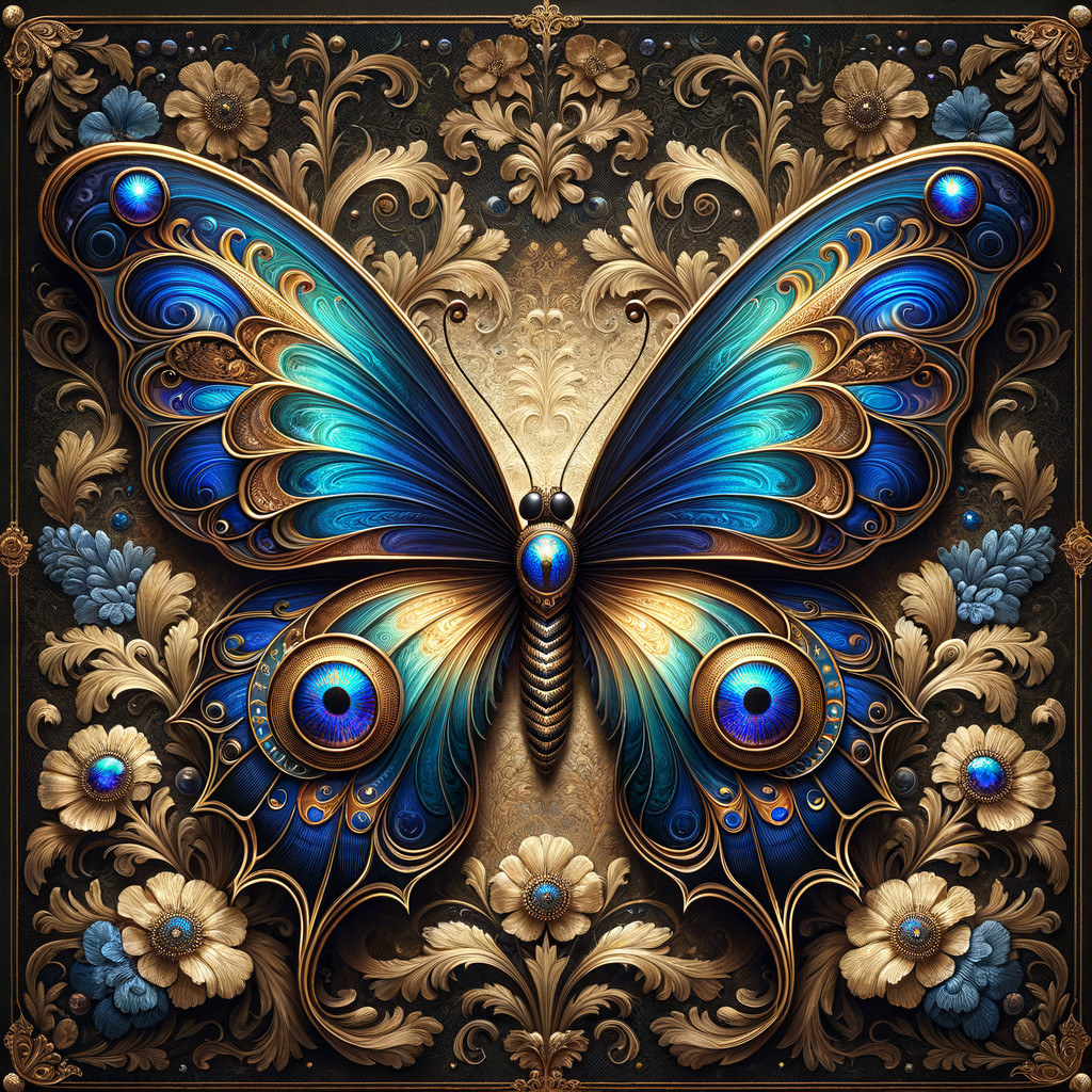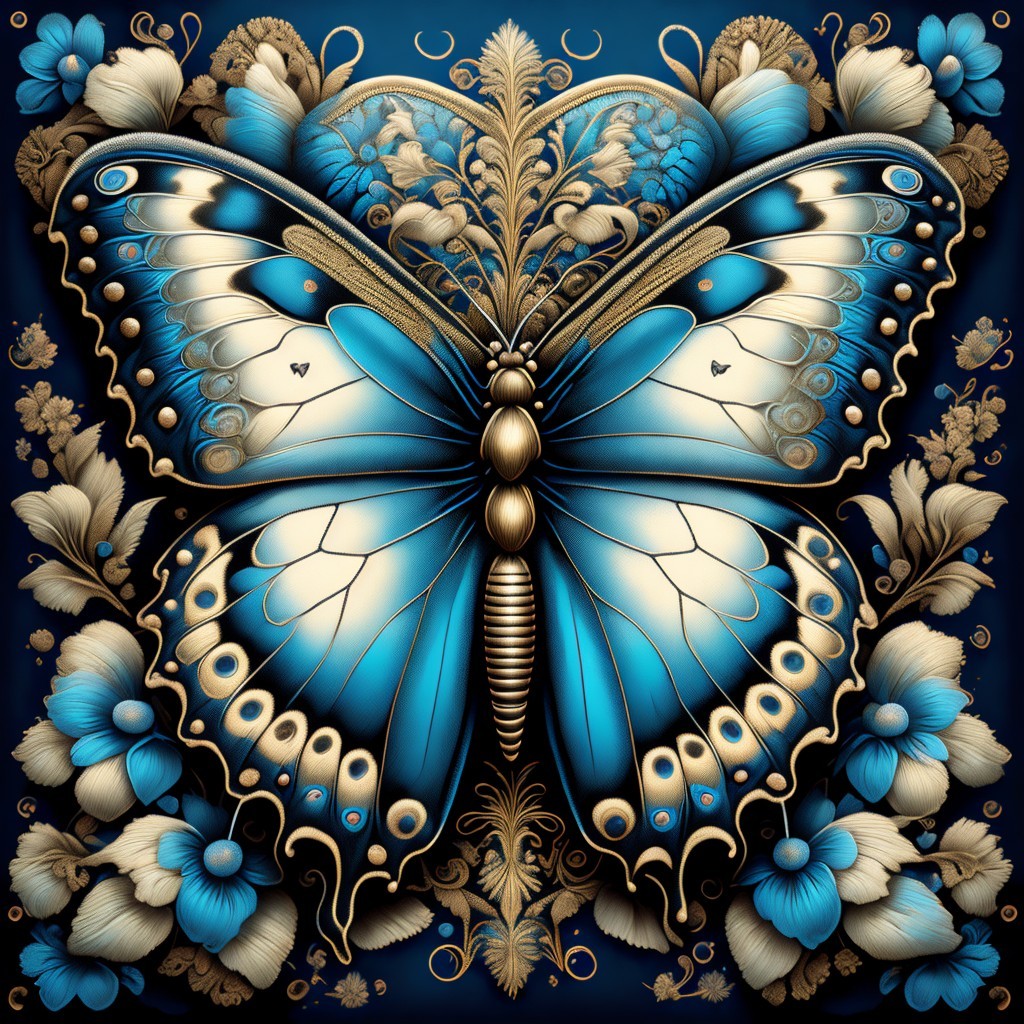 A digital artwork of a vibrant blue butterfly with detailed wings, surrounded by ornate gold floral patterns on a dark background.