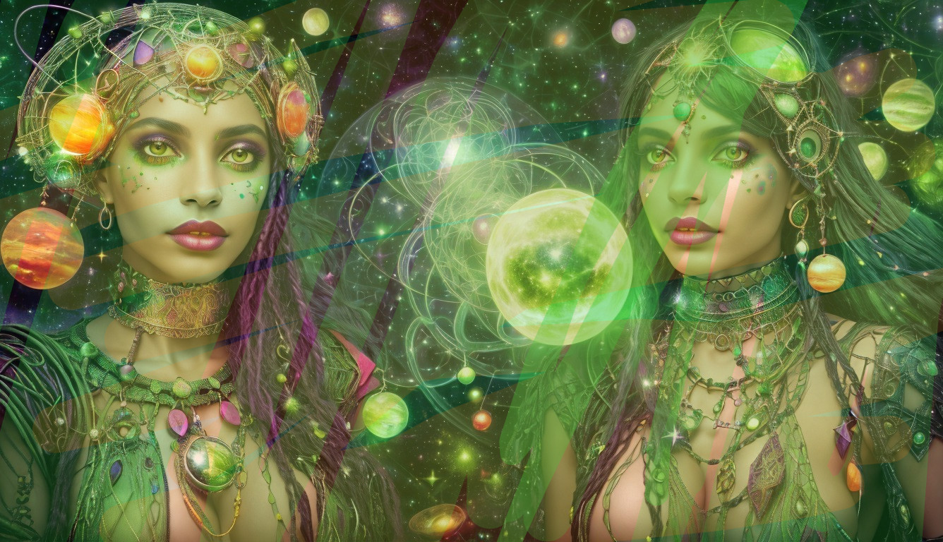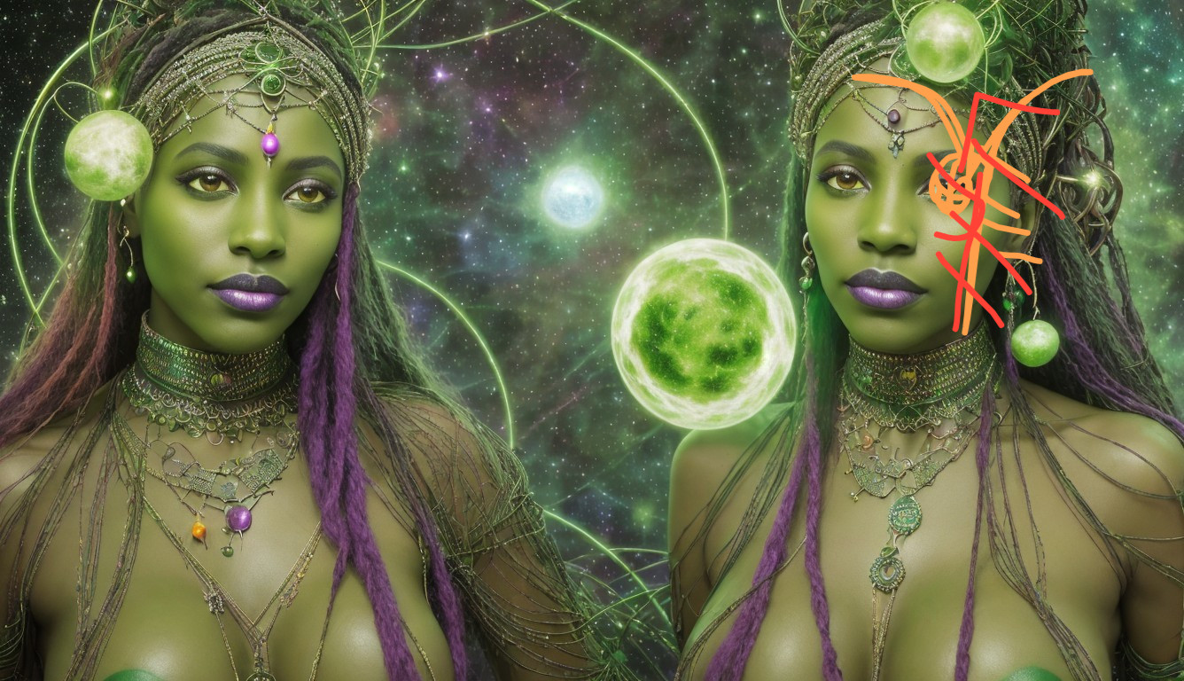 + Prompt:natural beauty of cosmic witches, nubian witch, celtic vampire, green skin sensuality, cosmic, Fine art inspired by Paul Klee and Dave McKean, a mix of photorealistic and abstract art, cosmic sensuality and green strings of stars, , stars, orbs, red fangs, steel leather, cybernetic clothes, wire mesh suits, interesting atmosphere