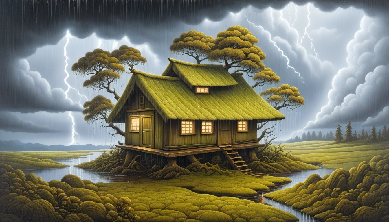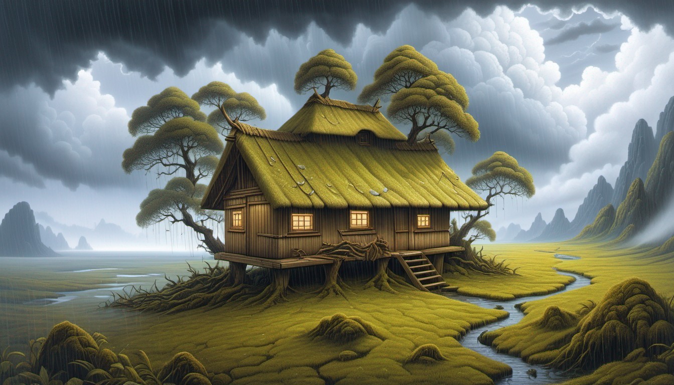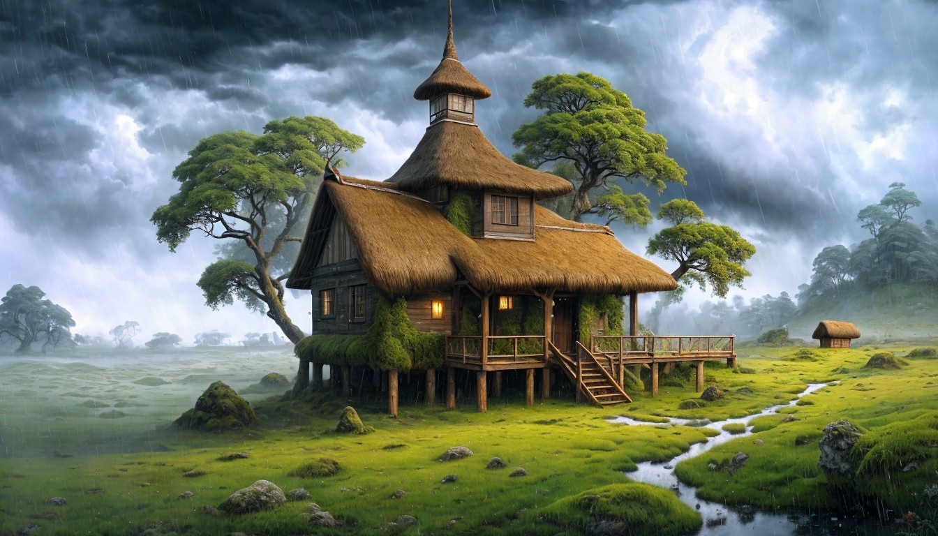 Black and White landscape with a small wooden hut with thatched roof, pouring rain, surreal, stormy clouds with bright flashes, pouring rain, mossy ground