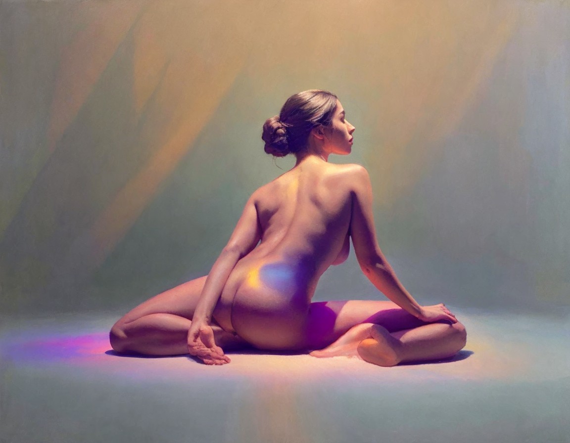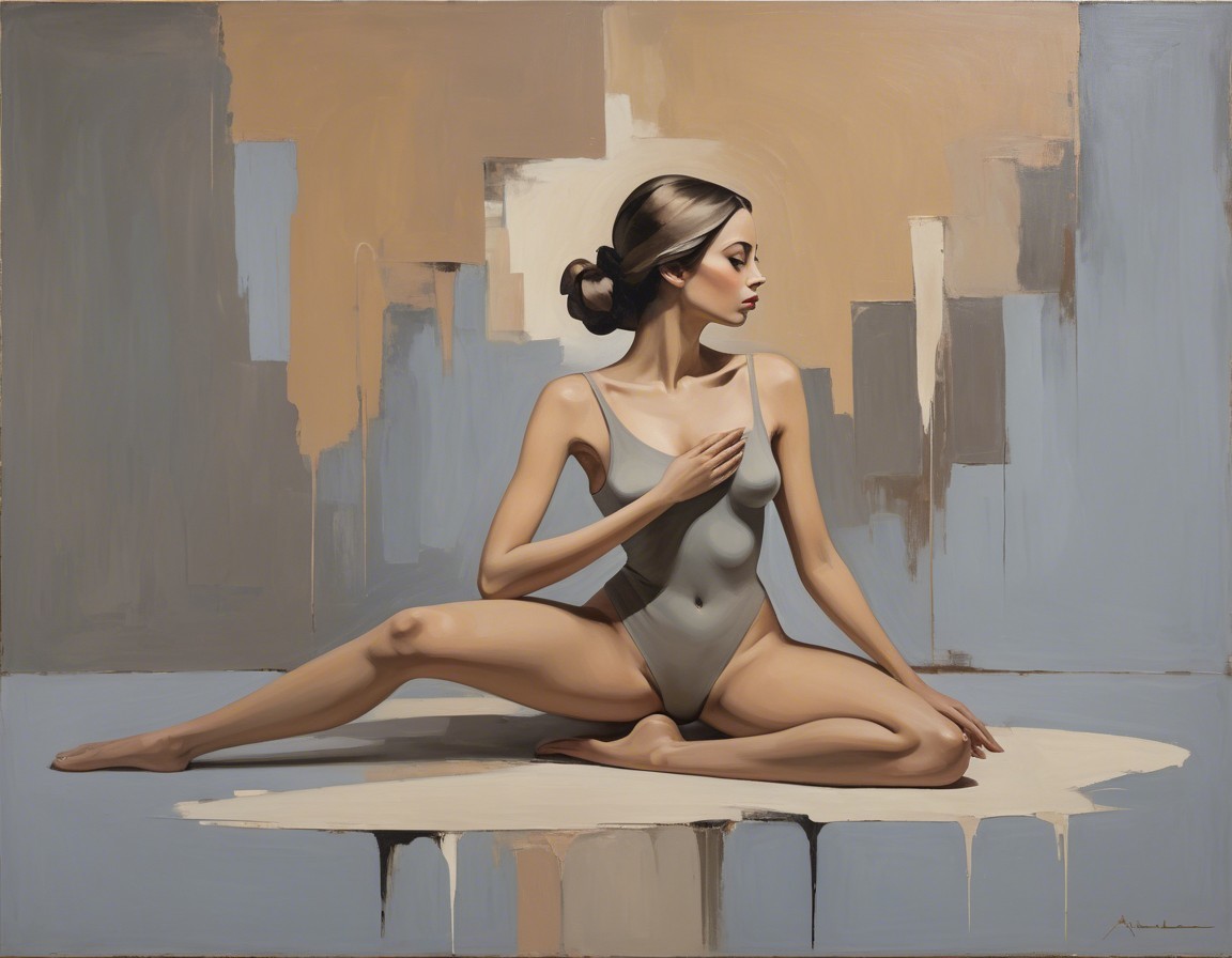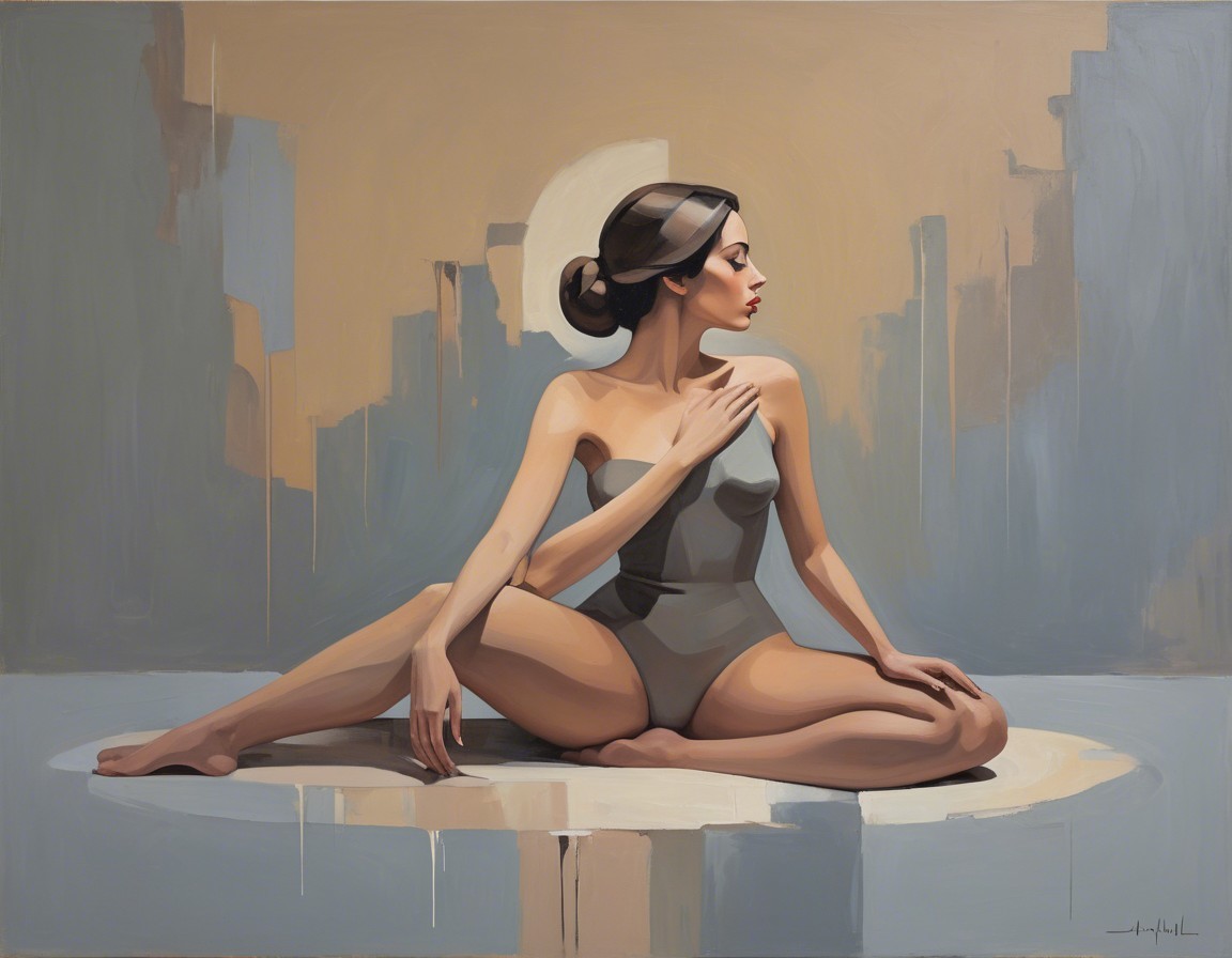 A painting of a woman seated against a geometric background, dressed in light attire, exuding a calm and reflective pose.