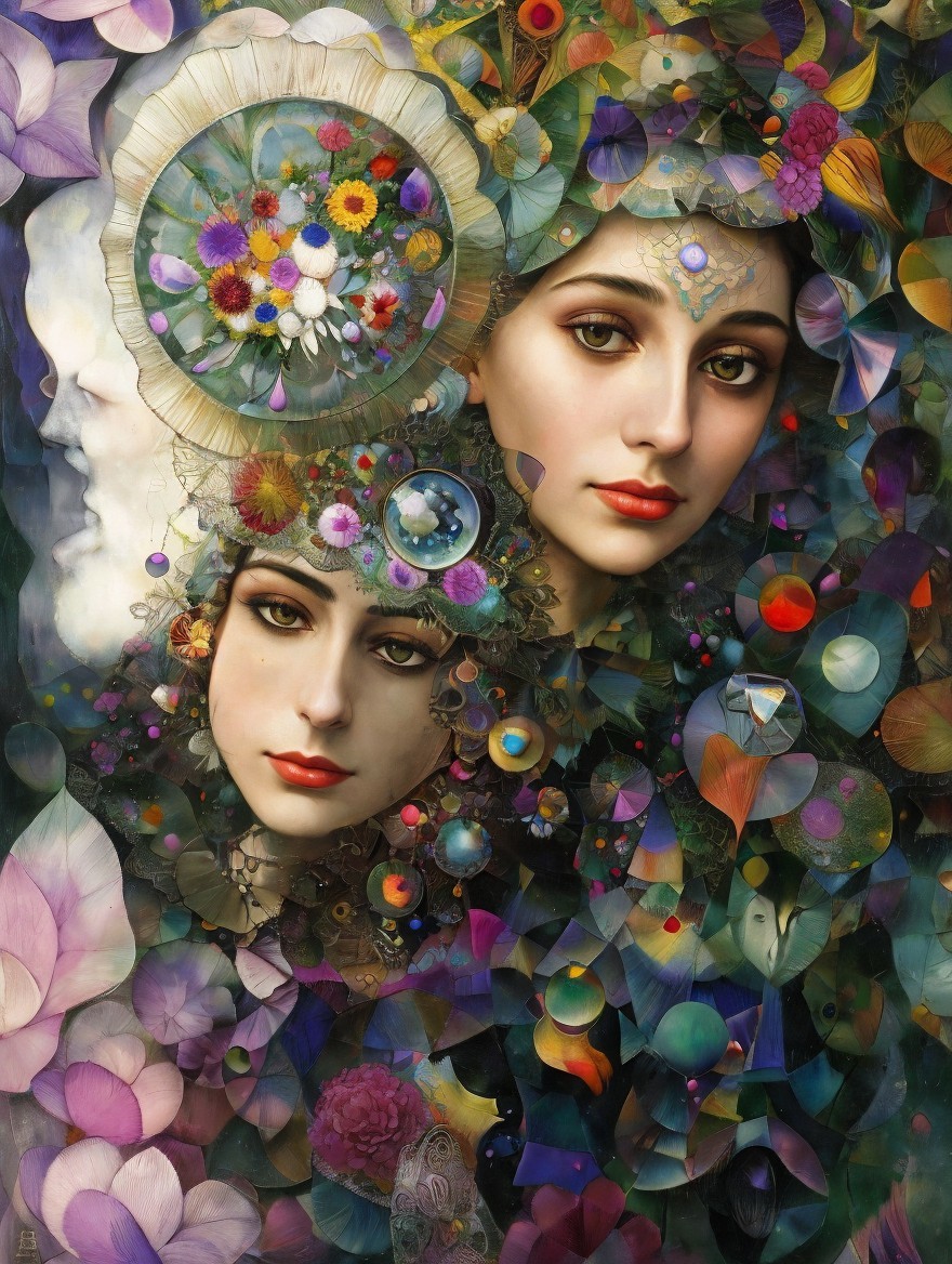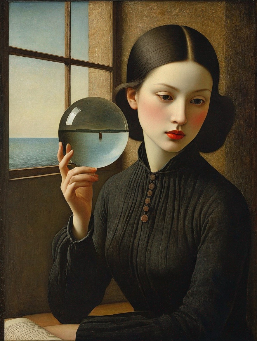 A portrait of a woman with a serene expression juxtaposed with a circular seascape and a solitary sailboat in the background.