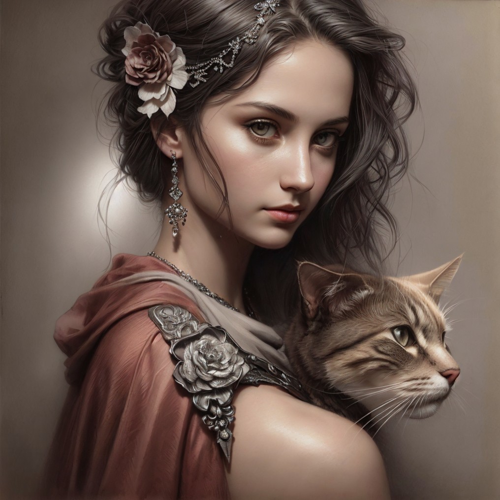 + Prompt:Charcoal sketch of an enigmatic girl with her cat on textured light beige paper that shows signs of water stains, rough shading technique channelling the styles of Krzysztof Lukasiewicz and Marc Simonetti, mysterious ambience, ultra-fine details, dramatic lighting.