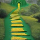 A vibrant green castle rises majestically in a cityscape, surrounded by lush greenery. A winding yellow brick path leads to its entrance, blending fantasy with urban life.
