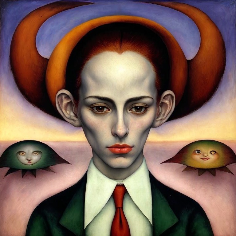 (Try from Lord Caramac the Clueless) - The image features a surreal portrait of a man with an intense expression, flanked by large, watchful eyes and horn-like shapes, set against a vivid, gradient background.