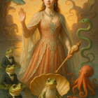 A regal figure in a flowing gown stands by water, adorned with a crown and jewels. Surrounded by elegantly dressed frogs and fish, she embodies a whimsical, enchanting fairy tale atmosphere.