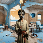 A striking painting of a monkey standing amidst colorful, dilapidated buildings. The monkey has a thoughtful expression, with a lush, green skirt and a vibrant sunset in the background.