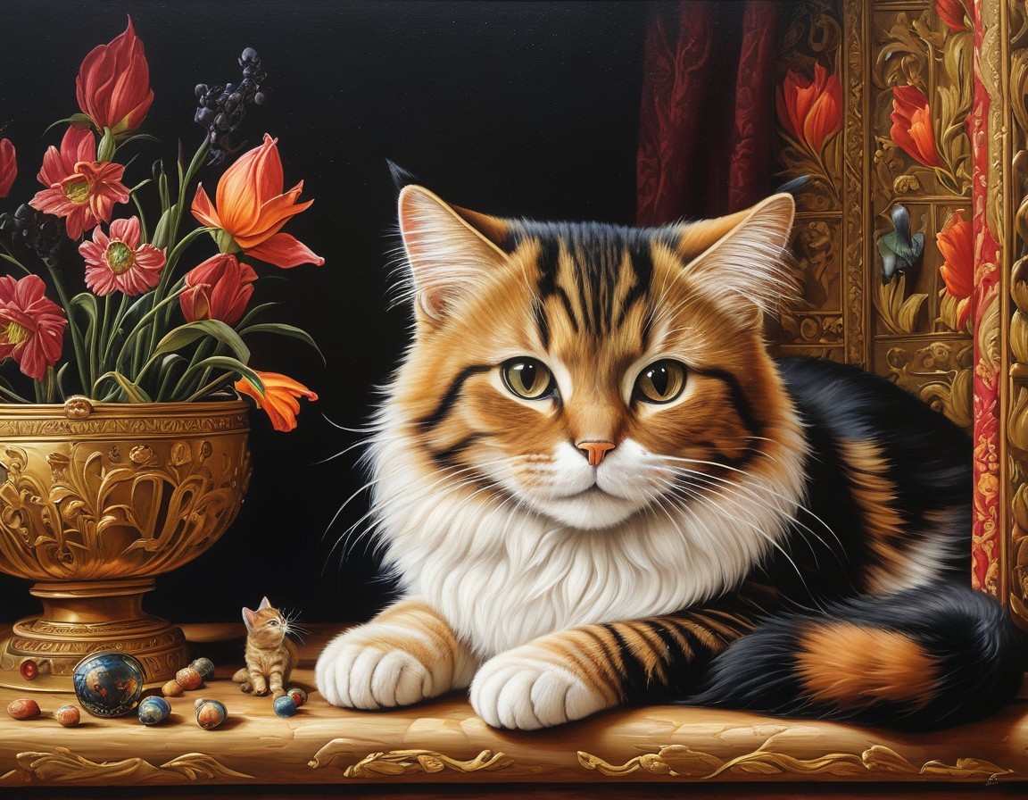 Multiple cats sitting in a wooden shelving unit with compartments, some striped and some solid colored, with a decorative vase.