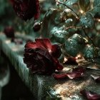 A serene scene featuring lush red roses adorned with dewdrops, resting on a textured stone surface. Petals scatter nearby, capturing the beauty and freshness of nature's elegance.