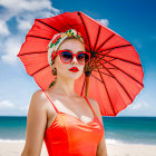 A young woman stands on a beach, wearing a vibrant orange swimsuit and a large rainbow-striped sun hat. The sky is bright blue with fluffy clouds, and the ocean glistens in the background.