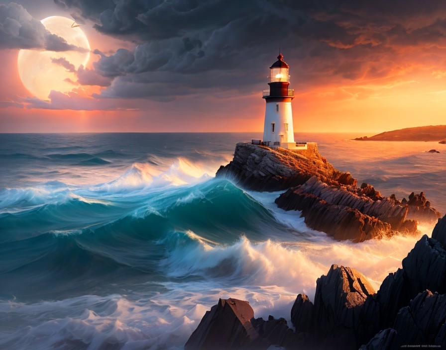 A lighthouse stands on a rocky cliff with tumultuous waves crashing below and a large moon illuminating the twilight sky.
