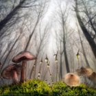 In a misty forest, tall trees rise shrouded in fog. A cluster of mushrooms with brown caps grows on a mossy patch, adding a whimsical touch to the serene, ethereal atmosphere of the scene.