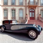 A classic 1930 Bugatti Royale vintage car is parked elegantly in front of an opulent mansion with intricate architectural details and grand steps, showcasing luxury and timeless design. Only 7 of these were ever made from 1927 to 1933.