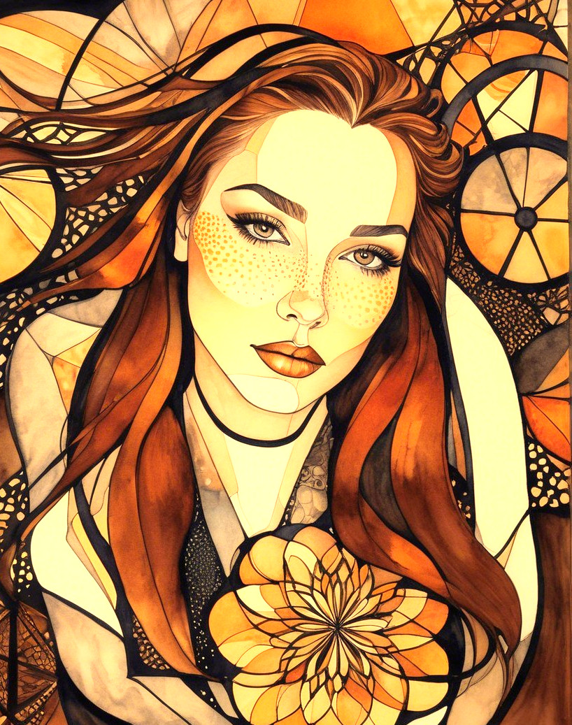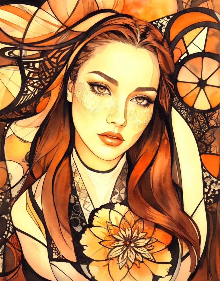 Fine line pencil sketch, stylized portrait with watercolor techniques, abstract portrait, top to bottom view, hues by Ed Binkley and Man Ray, modern and striking, shimmering, delicate geometric patterns, triadic color scheme metallic-honey burnt-orange brown-black, brightness 1.3, highly stylized by Ed Binkley and Ho Baron with flowing hair, vibrant colors blending, background integration, refined sgraffitto, reminiscent of stencil and street-art, complex coloring, simplistic line-art, patchwork features, disintegration, gradient inking, inkpunk, stippled textures, novelty architecture, decorative,, elegant, graphic novel,, displacement mapping 1.9, ambient occlusion 1.3, parallax occlusion 1.5, fantasy iconography, cel-shaded, sculpted, retrofuturistic sgraffito, divisionism, triadic color scheme, whimsical complementary colors, background, uhd, hdr, dof, debeh, bokeh, brightness 1.3, subsurface scattering 1.5, assemblage art, fractured linework, otherworldlydynamic lighting, squiggly line-art features, tall and stacked lines, dof, bokeh, debeh, negative lucas numbers, patchwork theme, banging, scruffy, retrofuturistic, exuding joyful pencil sketch art blend, painterly style, rich and saturated colors, bold brushwork, campy elegance, space-age & pulp sci-fi inspiration, psychedelic, futuristic, glowing, by Ed Binkley & Lawrence Schwinger