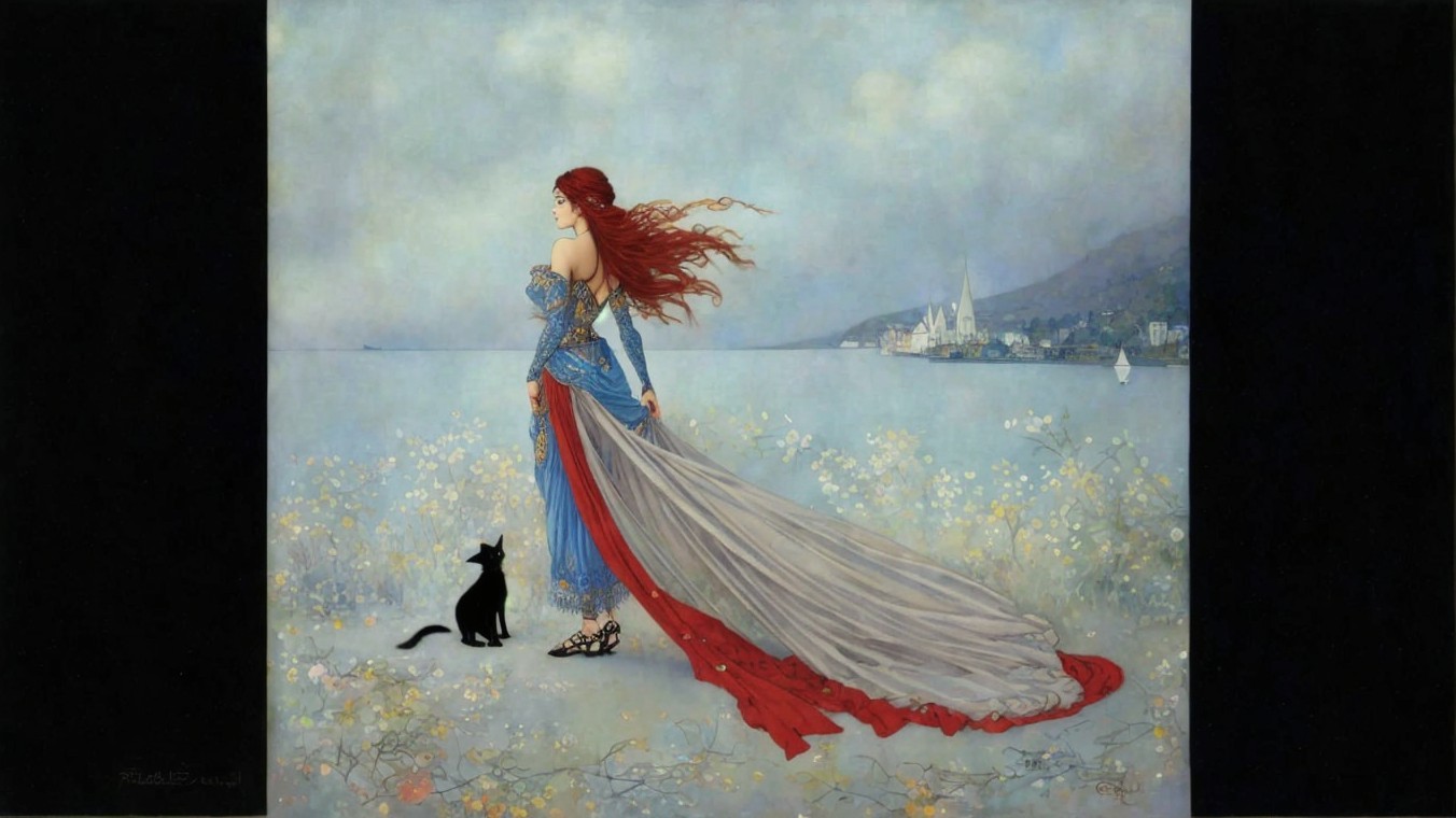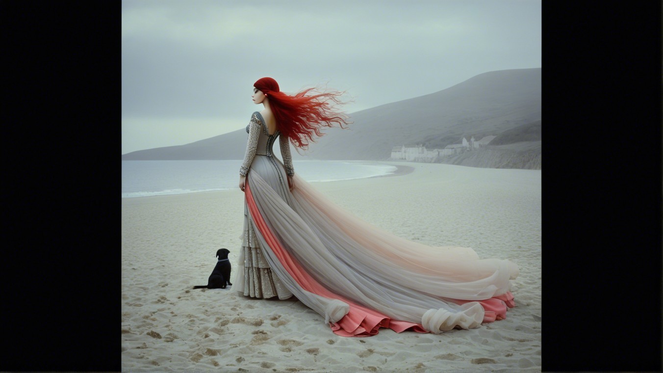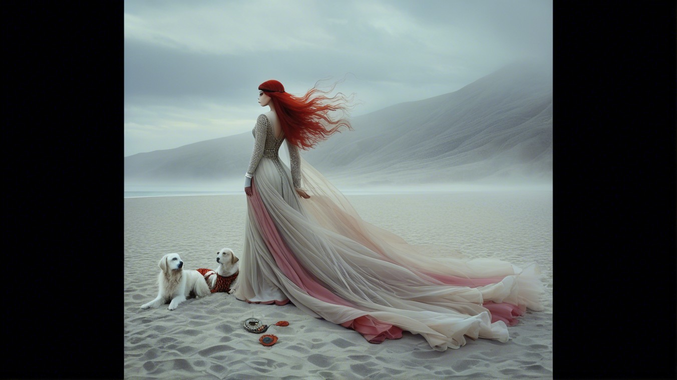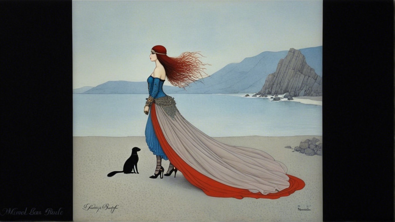 A stylized figure stands on a beach, dressed in a flowing gown with vibrant blue and red hues. The windswept hair and elegant pose convey a sense of strength and grace against a serene backdrop.