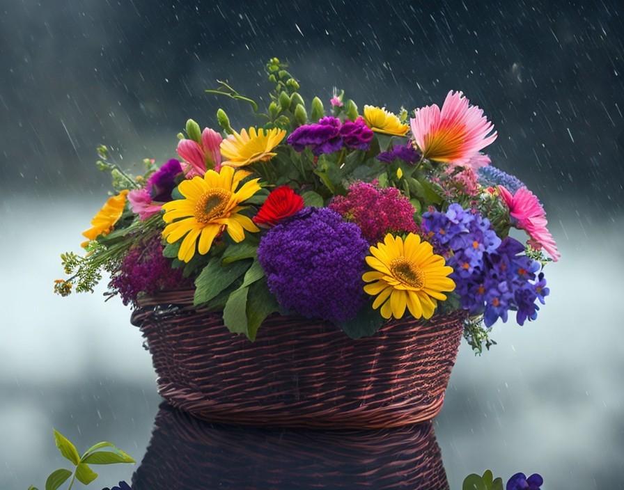 A vibrant basket of assorted flowers, with a felt hat amidst them, reflecting on a shiny surface under a gentle rain.