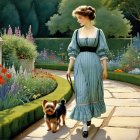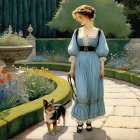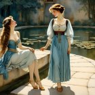 In a serene courtyard, two elegantly dressed women converse by a tranquil pool, surrounded by lush greenery and classical architecture, while a tiger lounges nearby, adding a touch of wild beauty.